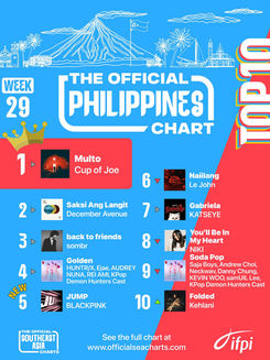 The Official Philippines Charts showcases the most popular local and international tracks in the Philippine territory. This data is presented by Philippines Recorded Music Rights powered by the International Federation of the Phonographic Industries' data on streams across all major platforms.